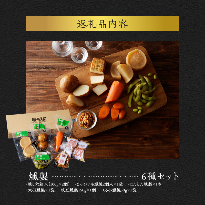 当店こだわりの詰め合わせ! 香り立つ大地の幸燻製6品セット【燻し奴、じゃがいも燻製、にんじん燻製、大根燻製、枝豆燻製、くるみ燻製】