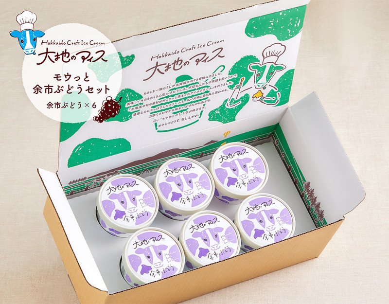 モウっと余市ぶどうセットは、余市町の代表的な農産物であるぶどうフレーバーの6個セットです。