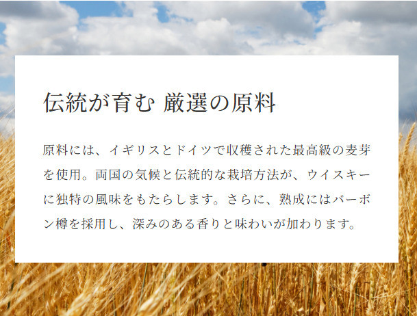 原料には、イギリスとドイツで収穫された最高級の麦芽を使用。両国の気候と伝統的な栽培方法が、ウイスキーに独特の風味をもたらします。さらに、熟成にはバーボン樽を採用し、深みのある香りと味わいが加わります。