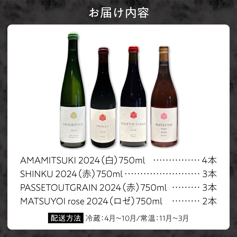 | 容量 | ①「AMAMITSUKI 2024」白/750ml 4本 ②「SHINKU 2024」赤/750ml 3本 ③「PASSETOUTGRAIN 2024」赤/750ml 3本 ④「MATSUYOI rose 2024」ロゼ/750ml 2本 |