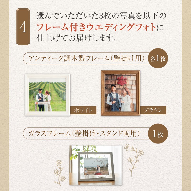 | 容量 | 本返礼品では、余市町内の魅力的なロケーションにて、 自然・農・ワイン文化を背景にした唯一無二のフォトウエディング撮影をご提供します。 ふるさと納税を通じて、余市町の魅力発信と未来への応援につながる体験型返礼品です。 ウエディングフォトだけでなく、誕生日、結婚記念日、家族の集合写真、あるいは何気ないけれど心に残る日常のワンシーンまで、 思い出に残る時間を大切に写し取ります。 ご寄附確認後、メールまたはお電話にてご連絡をさせていただき、 オンラインで撮影についての打合せをさせていただきます。 📸 撮影内容 余市町内でのロケーションフォトウエディング撮影 カメラマンが厳選したお写真データをギガファイル便にて後日送付 ※撮影データの中から、フレームに入れるお写真3枚をお選びいただきます。 ウエディングフォト(写真+フレーム) 選んでいただいた3枚のお写真を、以下のフレームに仕上げてお届けします。 アンティーク調木製フレーム ・ホワイト 1枚(壁掛け用) ・ブラウン 1枚(壁掛け用) ガラスフレーム 1枚 ・壁掛け/フォトスタンド両対応 ▶ 合計 3枚のフレーム付きウエディングフォト 🚚 お品のお届けについて ・撮影後、カメラマンセレクトによる写真データをギガファイル便で送付いたします。(100~200枚程度、最低100枚) ・フレームに使用する写真3枚をお選びいただきます。その後フレーム加工を行い、完成品を発送いたします。 ・写真選定後、1か月以内に発送いたします。 💐 特典 下記を撮影後プレゼントいたします。 ・ドメーヌタカヒコ Nana-Tsu-Mori O-Lie:1本 ・撮影用花束:2束もしくは1束 【撮影・編集】 Baby Meria フォトグラファー 田岡ゆか |