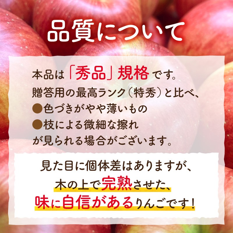 しかし、木の上でしっかりと完熟させた、味には一切妥協のないりんごです。「見た目よりも味とボリューム!」という皆様に、自信を持ってお届けいたします。