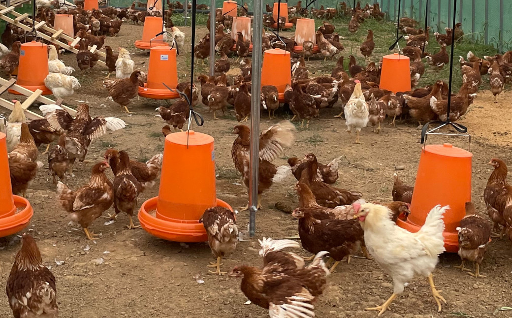 広々とした鶏舎で健康に育った鶏が産んだコロポックル村の平飼い卵。