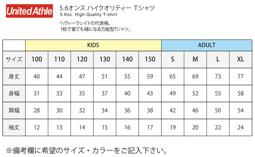 United Athle社の綿100%、5.6オンスのハイクオリティーTシャツを使用しています。