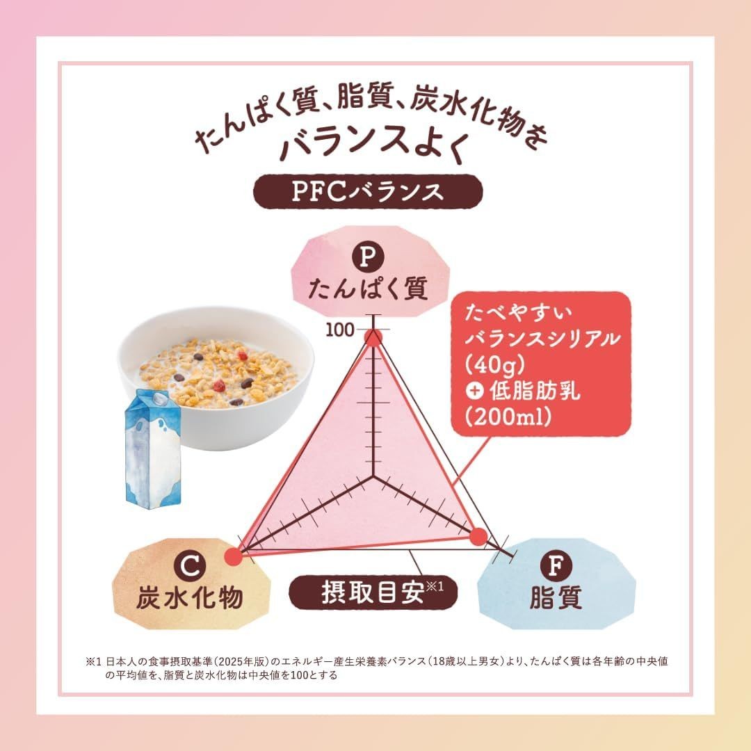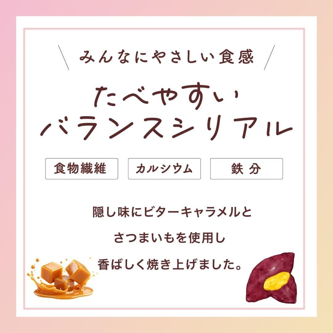 「たべやすいバランスシリアル」は、小粒設計で口に運びやすく、軽いサクサク食感が特長です。ドライフルーツを使用していないためベタつきにくく、最後まで快適に食べられます。食べやすさに配慮した設計で、幅広い年代に取り入れやすく、シリアルが苦手な方にもおすすめできる商品です。