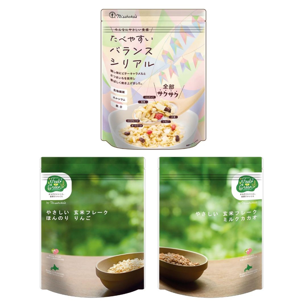 日食の「たべやすいバランスシリアル」と、Feel&Greenの玄米フレーク2種をセットにした食べ比べアソートです。やさしい甘さの「ほんのりりんご」「ミルクカカオ」と、小粒で食べやすいバランスシリアルを組み合わせました。軽やかな食感で毎日続けやすく、朝食や間食にも取り入れやすい、食べやすさを重視したセットです。