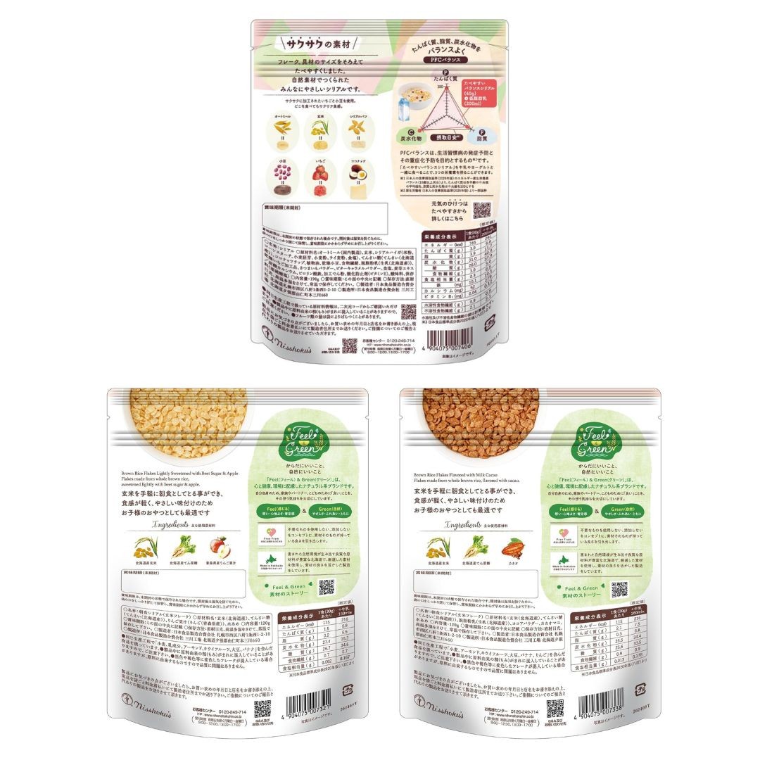 | 容量 | 日食 たべやすいバランスシリアル 190g ×4 日食 Feel&Green やさしい玄米フレーク ほんのりりんご 120g×4 日食 Feel&Green やさしい玄米フレーク ミルクカカオ 120g×4 |