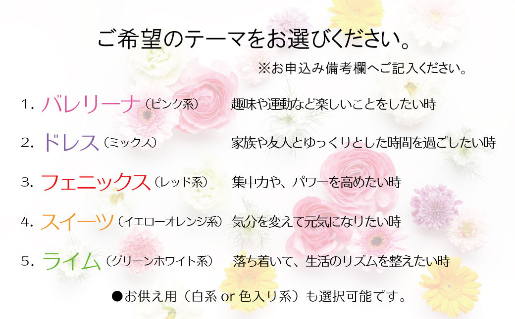 季節に合わせて当店デザイナーが5つのテーマに沿ってお花をチョイスしお届けします。
