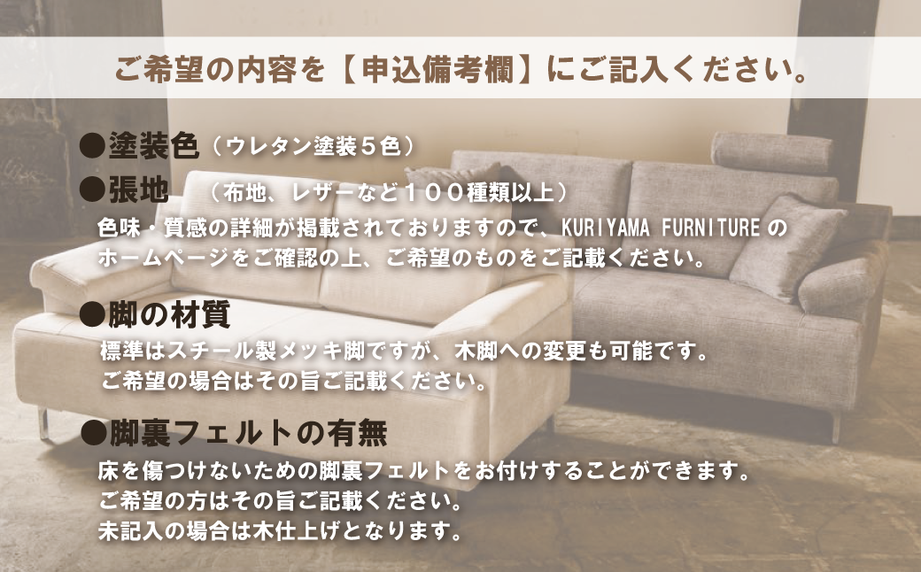 KURIYAMA FUNITUREホームページにて詳細を記載しておりますので、ご参照のうえ、ご希望の内容を【申込備考欄】にご記入ください。