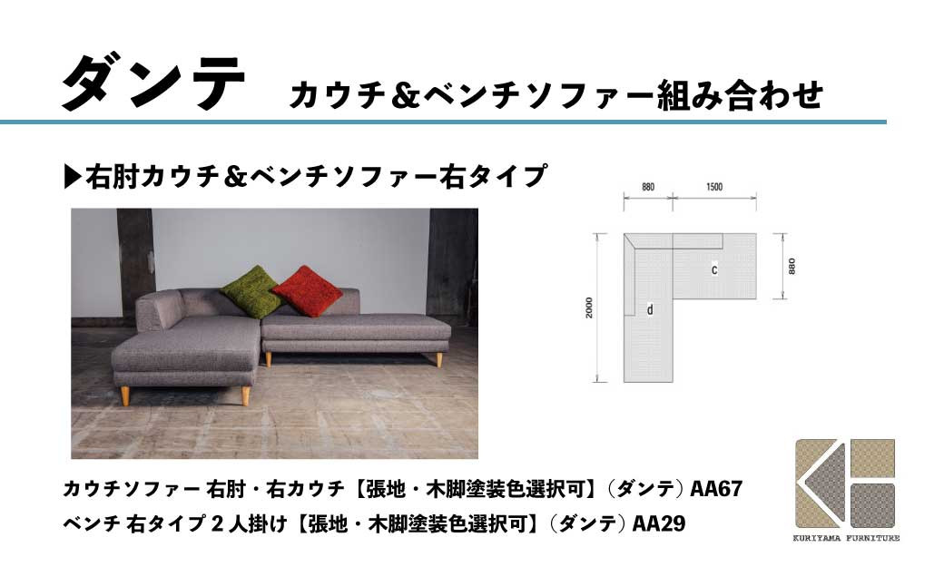 | 容量 | W880×D2000×H620mm(座面高さ380mm) 組立品 ※脚部のみ別梱包。手回しで設置できます。組立に工具は必要ありません。 ※張地100種類以上、ウレタン塗装色5種類からお選びいただけます。 下記リンク先を参照のうえ、ご希望の内容を【申込備考欄】にご記入ください。 https://kuriyama-furniture.com/material/ ※脚裏にフェルトが必要な際はお知らせください(ご指示がない場合は木仕上となります) ※お申込みの前に必ず品のサイズと搬入経路をご確認ください。 |