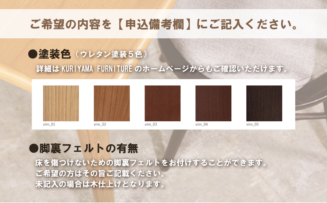KURIYAMA FUNITUREホームページにて詳細を記載しておりますので、ご参照のうえ、ご希望の内容を【申込備考欄】にご記入ください。