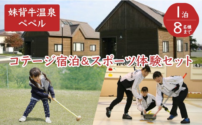 | 容量 | 妹背牛温泉ペペルコテージ(8名)の宿泊券(1泊)・パークゴルフ体験(夏期)又はカーリング体験(冬期) ※宿泊及びスポーツ体験は事前予約制。宿泊・スポーツ体験はいずれも8名様まで。 |