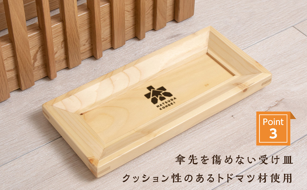 表面はクリアー塗装で木目を残し、トドマツ材の受け皿はクッション性があり、傘を傷めない様な素材で製作しました。