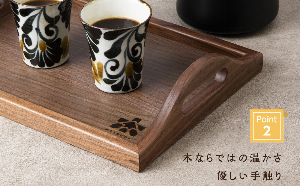 ブラックウォールナット材を使用し、職人の手で1つ1つ丁寧に作り上げた、贅沢な【木製トレイ】となります。
