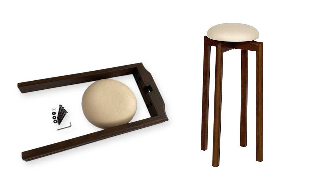 脚木部は落ち着いた濃いめのブラウン塗装にしました。ちょこっと乗っている白い座面をより引き立てる色合いです。