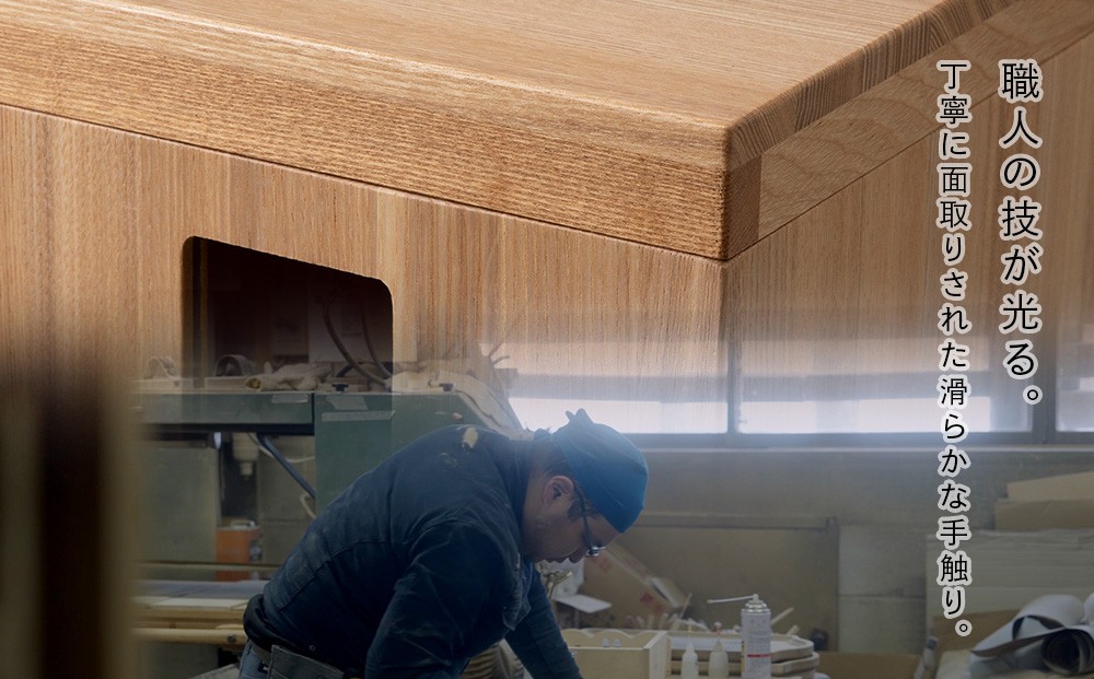 北海道東神楽町の大自然が育てたタモの無垢材のみを使用し、職人の手で1つ1つ丁寧に作り上げました。