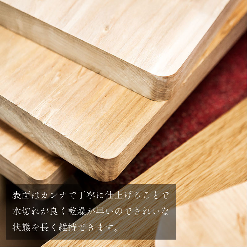 イベントで対面販売している際に「カビないでしょうか?」「すぐ黒くなって・・・」などの声を多く聞きます。お話を聞くとほとんどの場合がスプルスなど松や針葉樹で製作されたもので、安価で大量に綺麗なまな板が作れる反面、まな板としての耐腐朽性や耐久性には難がある材です。HOKUONのまな板は木の種類そのものが違い、表面はカンナ仕上げで非常に滑らか、サンダー仕上げのまな板と比べて水の切れが良く乾燥が早いので綺麗な状態を長く維持できます。もちろん木ですので経年変化をしていきます。綺麗にしようと漂白剤などを使用すると木の繊維が持つ強度が失われるので反対に腐食を早めてしまう場合があります。通常のお手入れは食器用洗剤で洗い、立てて乾燥していただければ十分です。