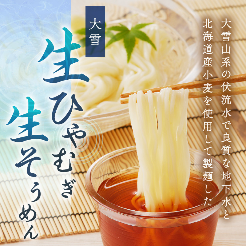 東川町の地下水を使用し北海道産小麦100%使用で製麺した生ひやむぎ・生そうめんで、一般的な乾麺を茹でた食感とはまた違い、生麺独特のコシの強さとツルツル感で味わい深い涼麺の詰合せです。