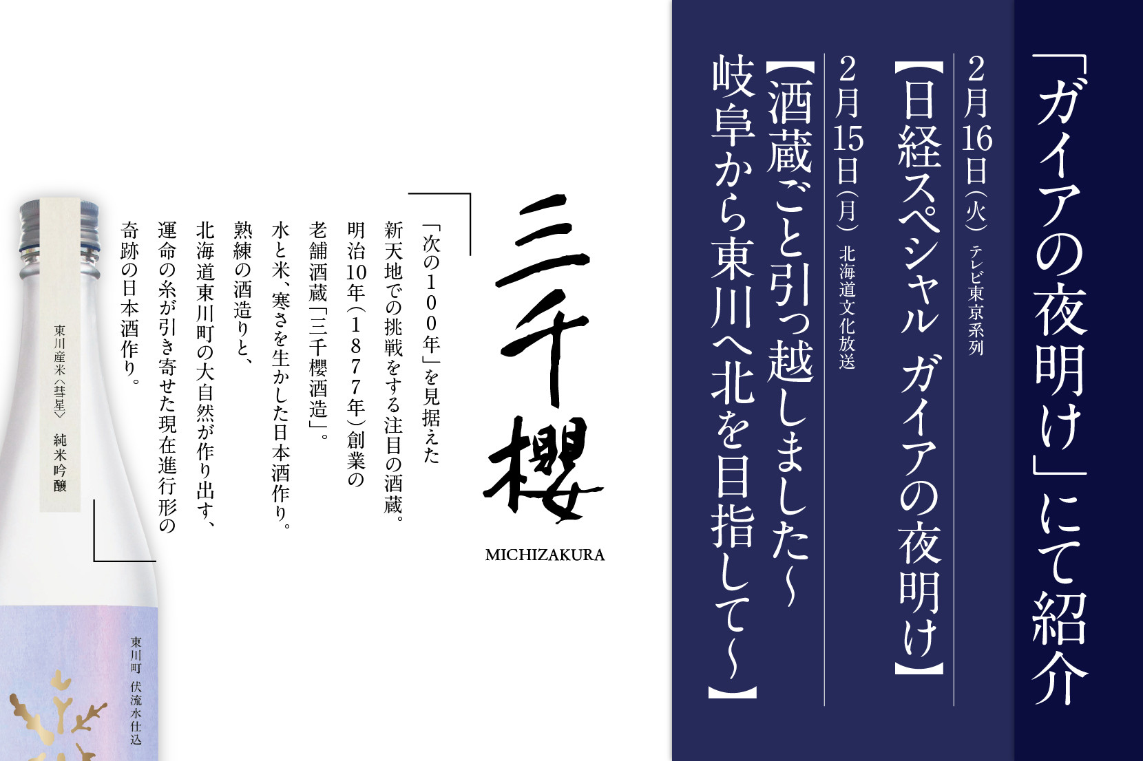 明治10年(1877年)創業の老舗酒蔵「三千櫻酒造」の「次の100年」を見据えた新天地での挑戦。熟練の酒造りと、北海道東川町の大自然が作り出す、運命の糸が引き寄せた奇跡の日本酒作り。