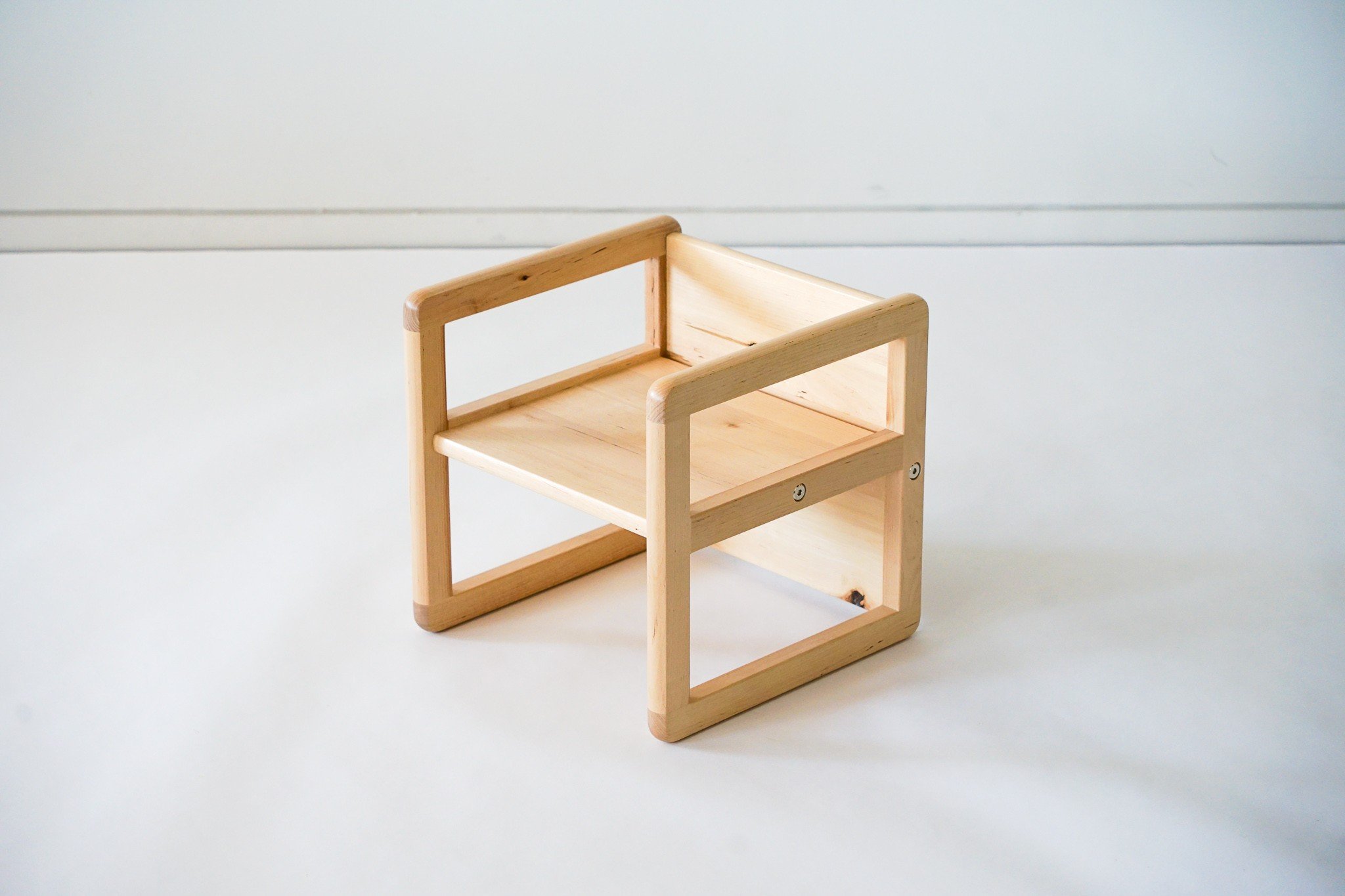 白樺材で製作した、木と暮らしの工房の子ども椅子。椅子の上下を反転させることで、高さの異なる椅子として使用することが可能なため、長く使うことができます。