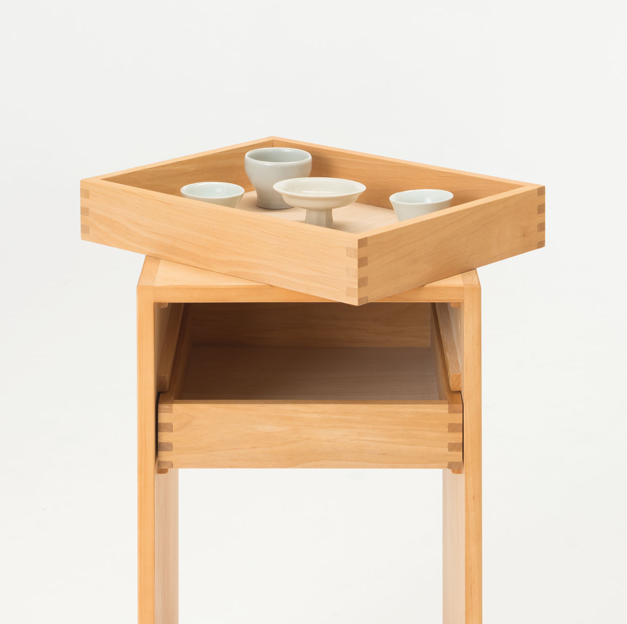 引き出しはトレー式で、下段はオープンタイプ。この特徴的なデザインは、デスクシーンのみならず、テーブルとの組み合わせも考えて生まれたデザイン。自由度が高く、発想次第で様々な使い方が可能です。また、天板の裏側にある手がかりの溝がワゴンの移動をサポート。さらに、フレーム全てを無垢材で製作することで、移動の際の安定性と耐久性を高めました。