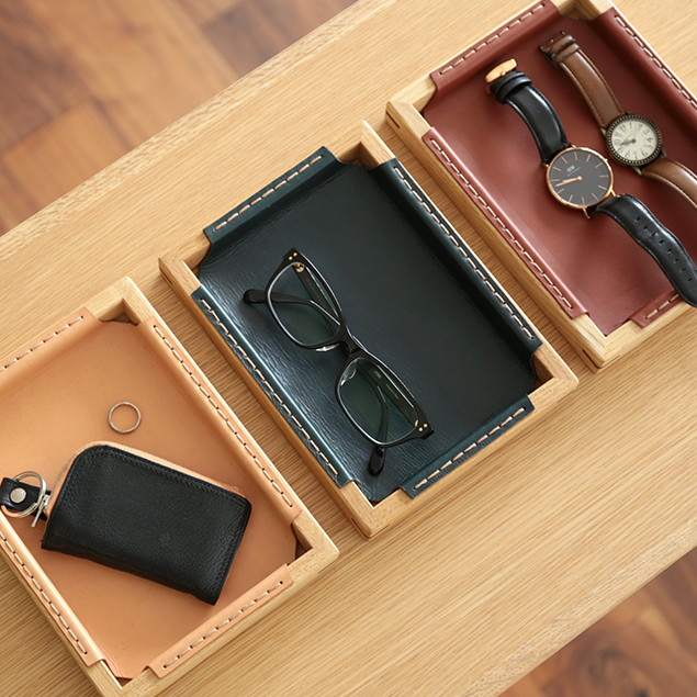 そんな小物を置いておくのにおすすめなのが、本革を張り込んだ本格派嗜好のトレイ。