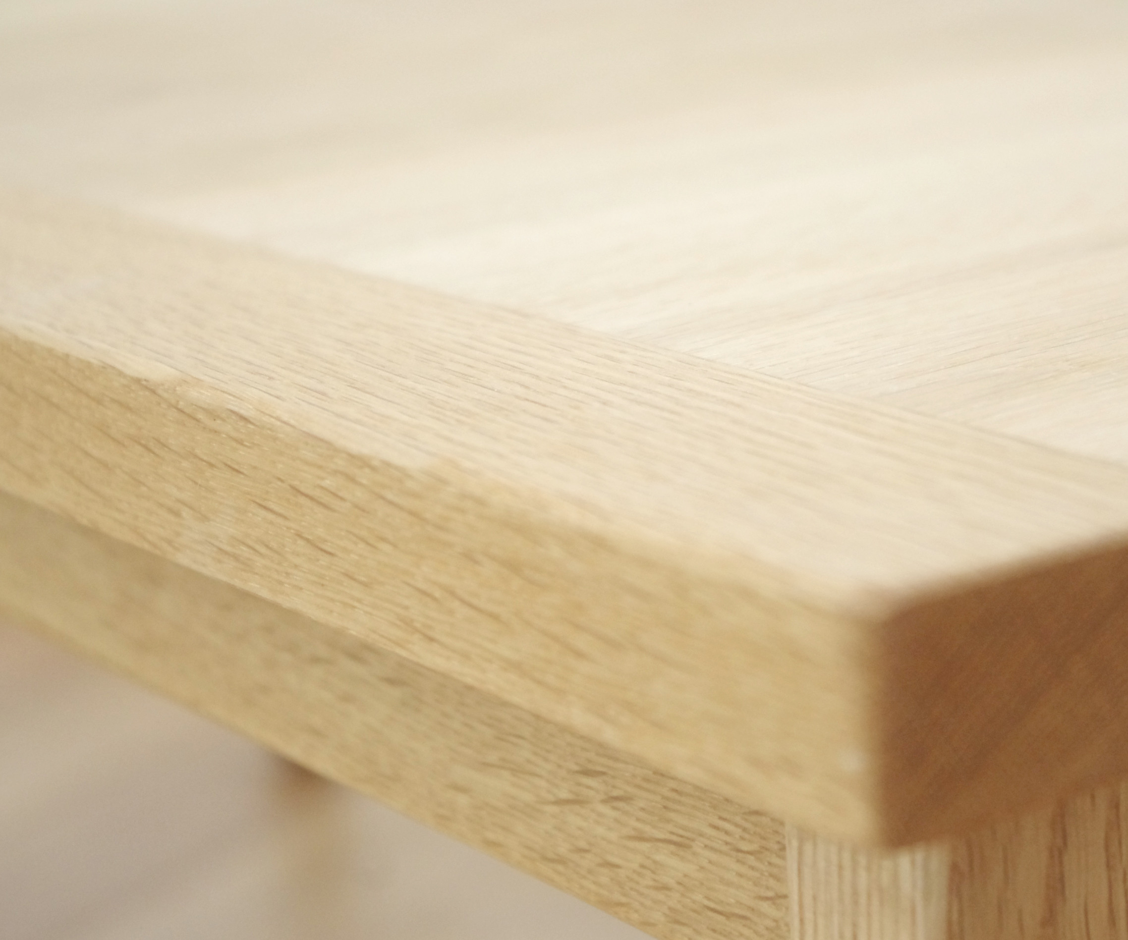 「天然」を意味するルオントは、北海道産のナラ材、天然皮革の取っ手、自然派塗料のオイル仕上げです。幕板のスリットで見た目も軽やかな印象のテーブル。薄型の引出付。