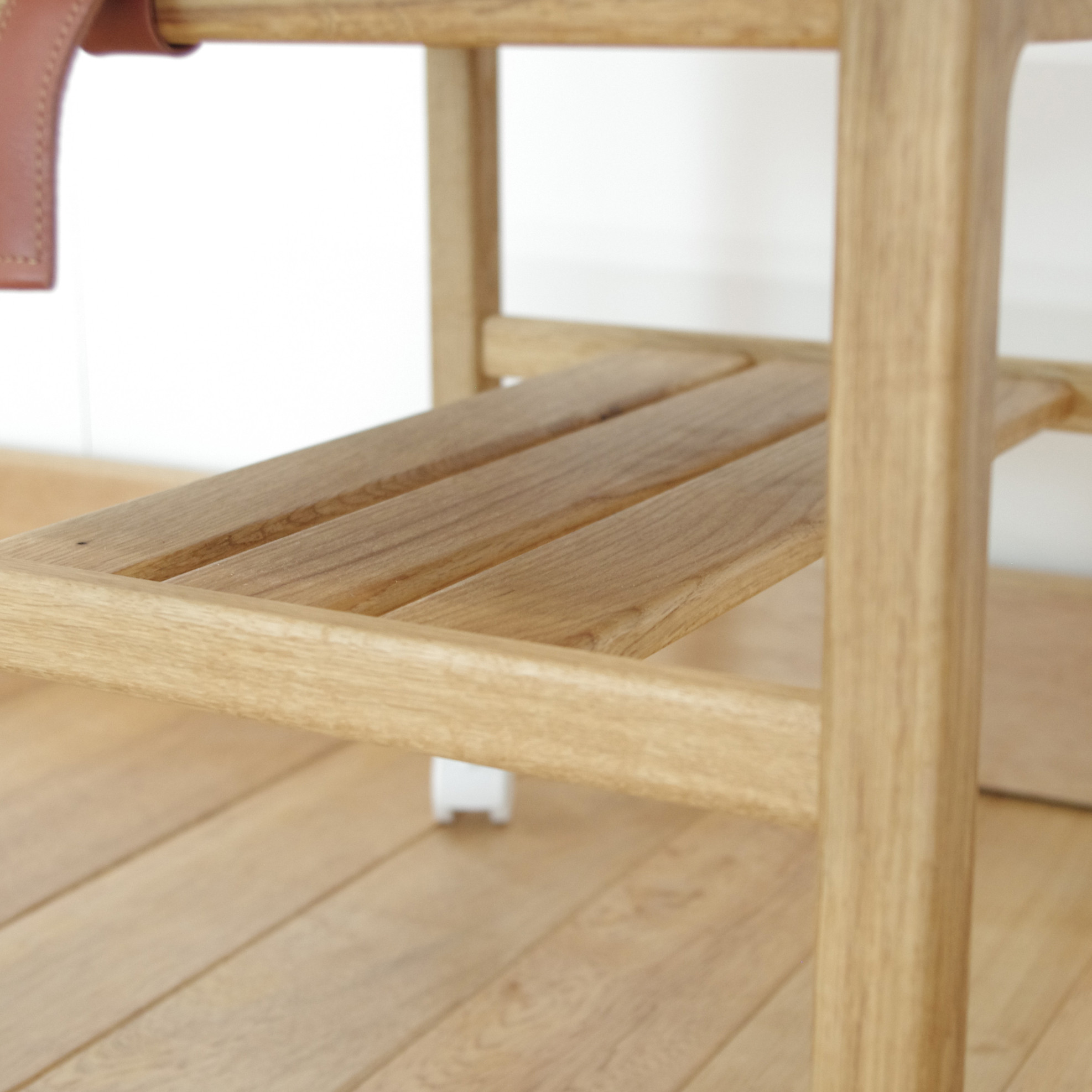 「天然」を意味するルオントは、北海道産のナラ材、天然皮革の取っ手、自然派塗料のオイル仕上げです。多用途に使えるサイドテーブル。脚の一方のみにキャスターがついており、反対側にある尻尾のような革の引手で、茶目っ気たっぷりに引っ張って移動することもできます。