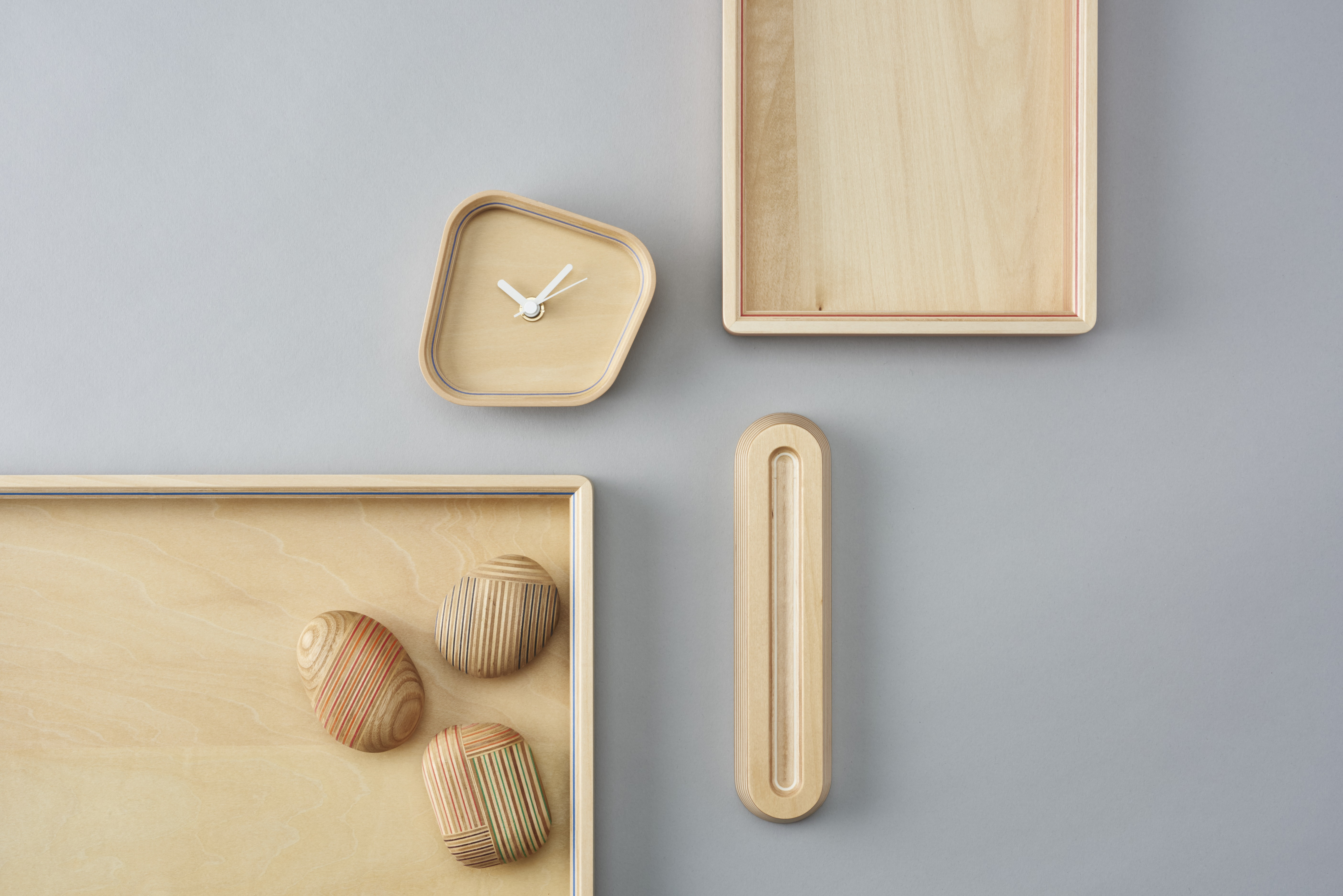 製品はカラフルな再生紙と国産のベニヤを組み合わせ、高い木工技術で作られたユニークな「Paper-Wood」を主な材料にしています。