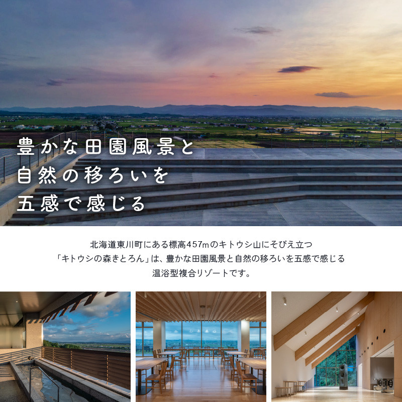 北海道の中央付近、東川町にある標高4 5 7mのキトウシ山にそびえ立つ「キトウシの森きとろん」は、心と身体の至福へのリトリートが叶う、豊かな田園風景と自然の移ろいを五感で感じる温浴型複合リゾートです。