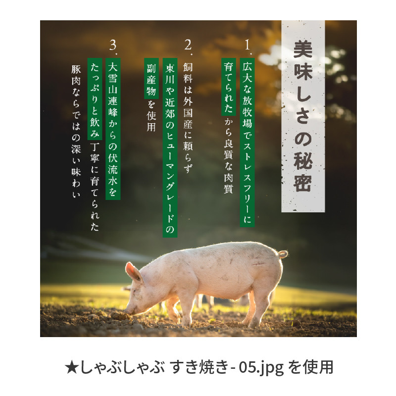 ストレスフリーの環境で育った豚は良質な肉質に育ち、さらに飼料には外国産に頼らない地域の農家さんや飲食店、製麺所や東川や近郊のヒューマングレードの副産物を使用しております。