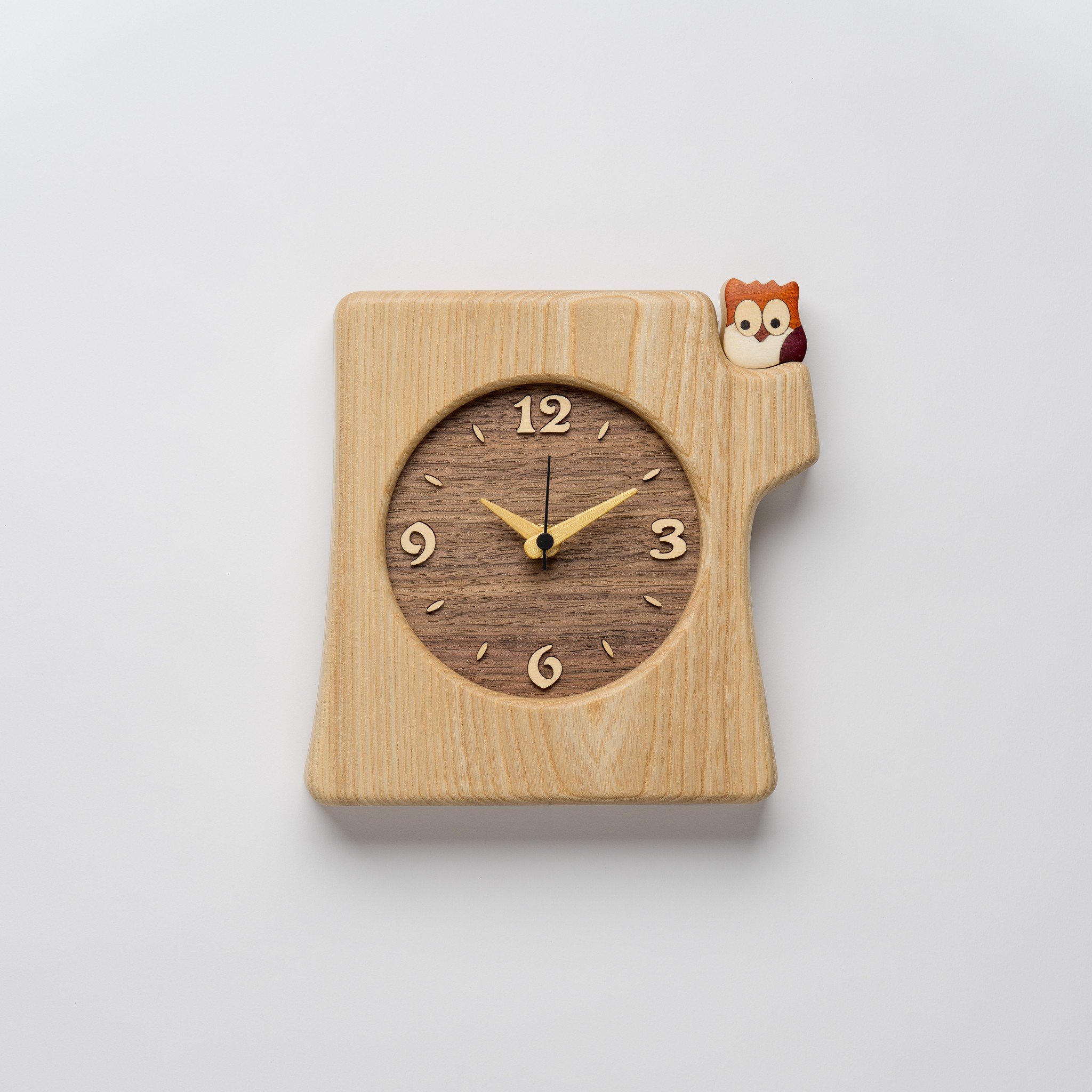 森の奥の切り株で休憩している小さなふくろうをモチーフにした時計。