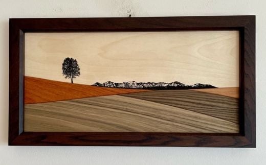 美瑛町の美しい風景を自然の色合いと木目の流れを活かした組木技法で再現しました。