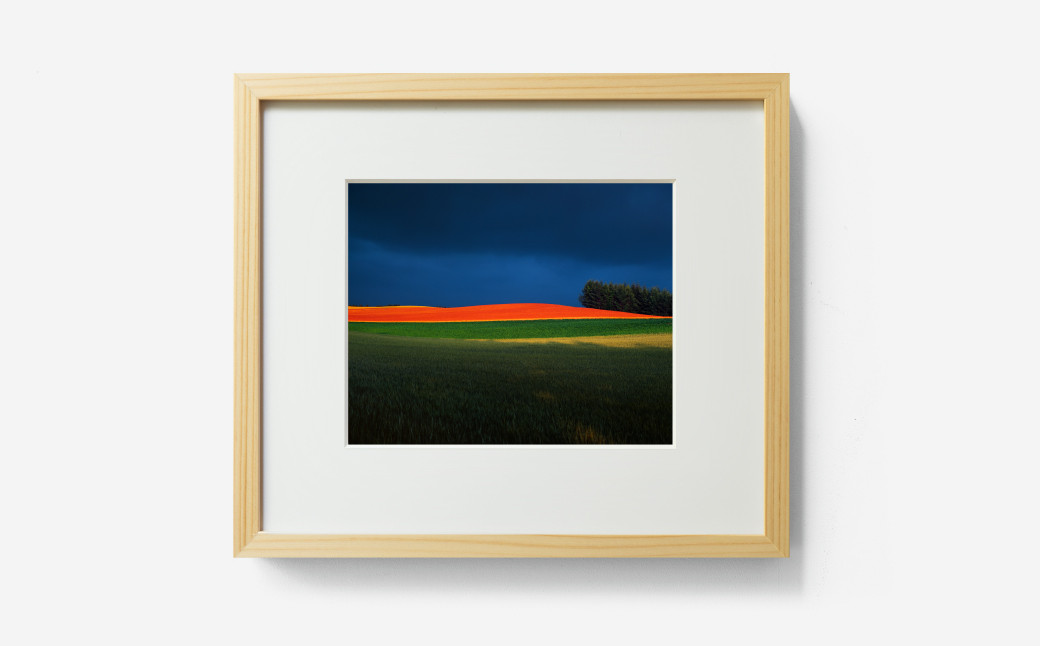 美瑛一帯の丘の風景をとらえた白木額付きキャビネサイズのオリジナルプリントです。 前田真三 額付き写真(白木額) キャビネサイズ[041-09]