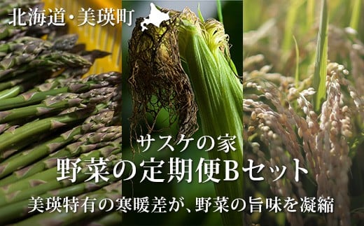 「丘のまちびえい」の旬の野菜を定期便でお届けします! 【先行予約】 野菜 定期便 C 3回便 <令和8年産 > セット 詰め合わせ サスケの家 グリーンアスパラ2kg(L~2L)、秋野菜(かぼちゃ1~2個・じゃがいも 約10kg)・米(ななつぼし)10kg[062-03]