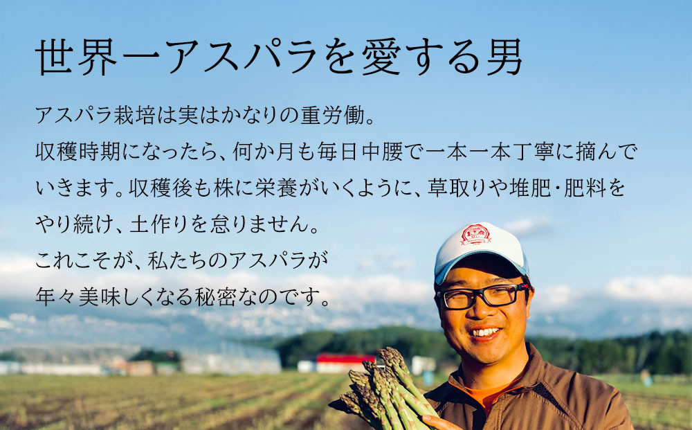毎日中腰になりながら、一本一本丁寧に摘んだアスパラを、ぜひ通販でお取り寄せして、皆様に美味しく味わっていただければ幸いです。