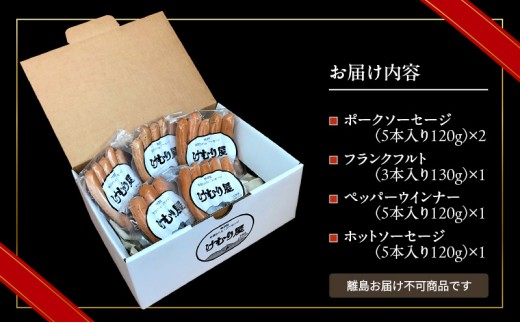 容量 | ポークソーセージ(5本入り120g)×2 フランクフルト(3本入り130g)×1 ペッパーウインナー(5本入り120g)×1 ホットソーセージ(5本入り120g)×1 |