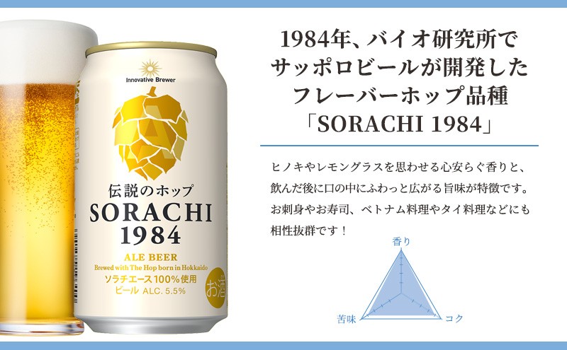 杉やヒノキ、レモングラスを思わせる安らぐ香りを独自のドライホッピング製法で引き出し、軽やかな味に仕上げました。飲んだ後、口の中にふわっと広がる旨味を【SORACHI1984】でお愉しみください。