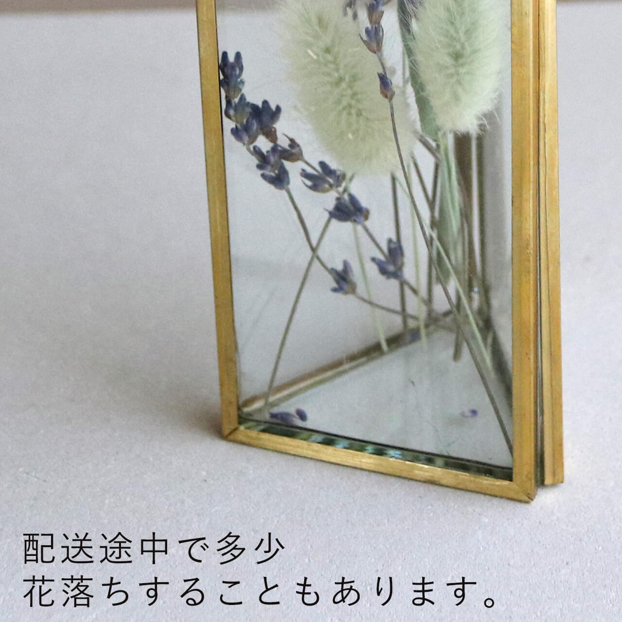 ゴールドの淵がかわいいガラスベースにドライフラワーをセットして、テラリウムのようにデザイン。