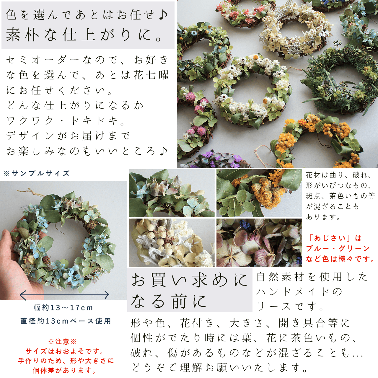 お好きなカラーを選ぶだけで花七曜らしい素朴なデザインのミニリースが届くドライフラワーセミオーダーリースが登場です。