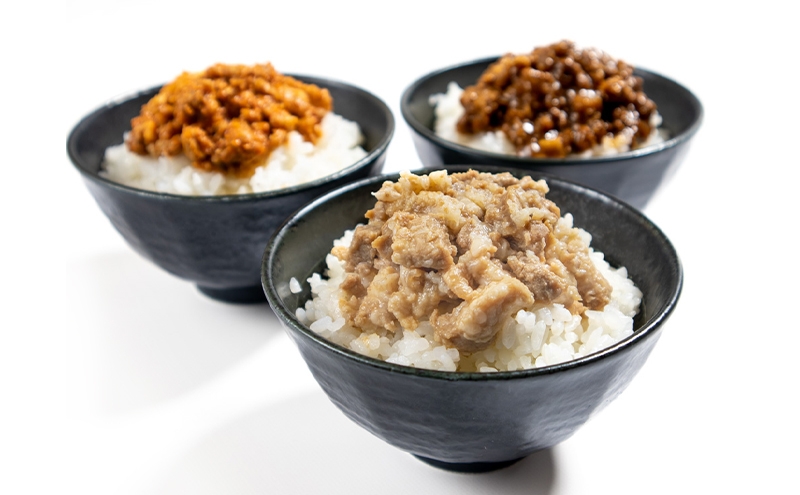 バター醤油、デミグラス、コチュジャンベースのピリ辛ナッツ、異なる3種の味つけをした豚そぼろはご飯のお供としてはもちろん、