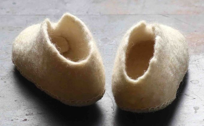 私たちが大切に育てた羊の毛を洗い、フェルトという加工方法で、赤ちゃんが初めて履くのにふさわしいぬくもりあふれるベビーシューズを作りました。100%手作りです。ウールは、撥水効果を持ちながらも湿気を逃すので、濡れにくく、蒸れにくい。また、フェルトという加工方法は空気を多く含むので、軽くてとても暖かです。赤ちゃんのちいさな足を快適に守ります。