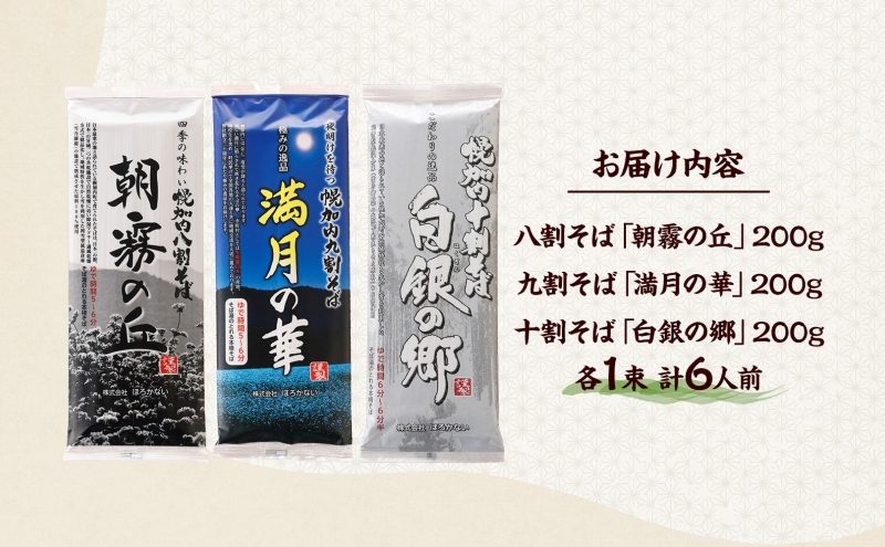 [№5795-0416]高級そば3種セット 各200g×1束 計6人前 北海道 幌加内 十割そば 白銀の郷 九割そば 満月の華 八割そば 朝霞の丘 蕎麦 乾麺 麺 常温 ソバ 北海道 グルメ 無塩 備蓄 無添加 食塩不使用 国産 お取寄せ ギフト 人気 ほろかない