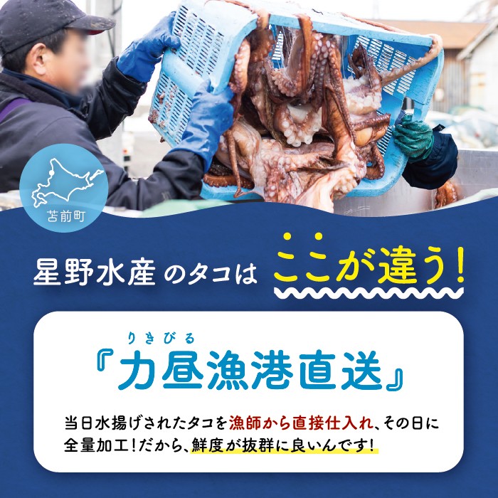 昭和51年創業、北海道苫前町のタコ加工専業メーカーです。二代目・星野代表が地元産のミズダコのみを厳選。道内の回転寿司店など「プロの現場」でも長年愛用されています。