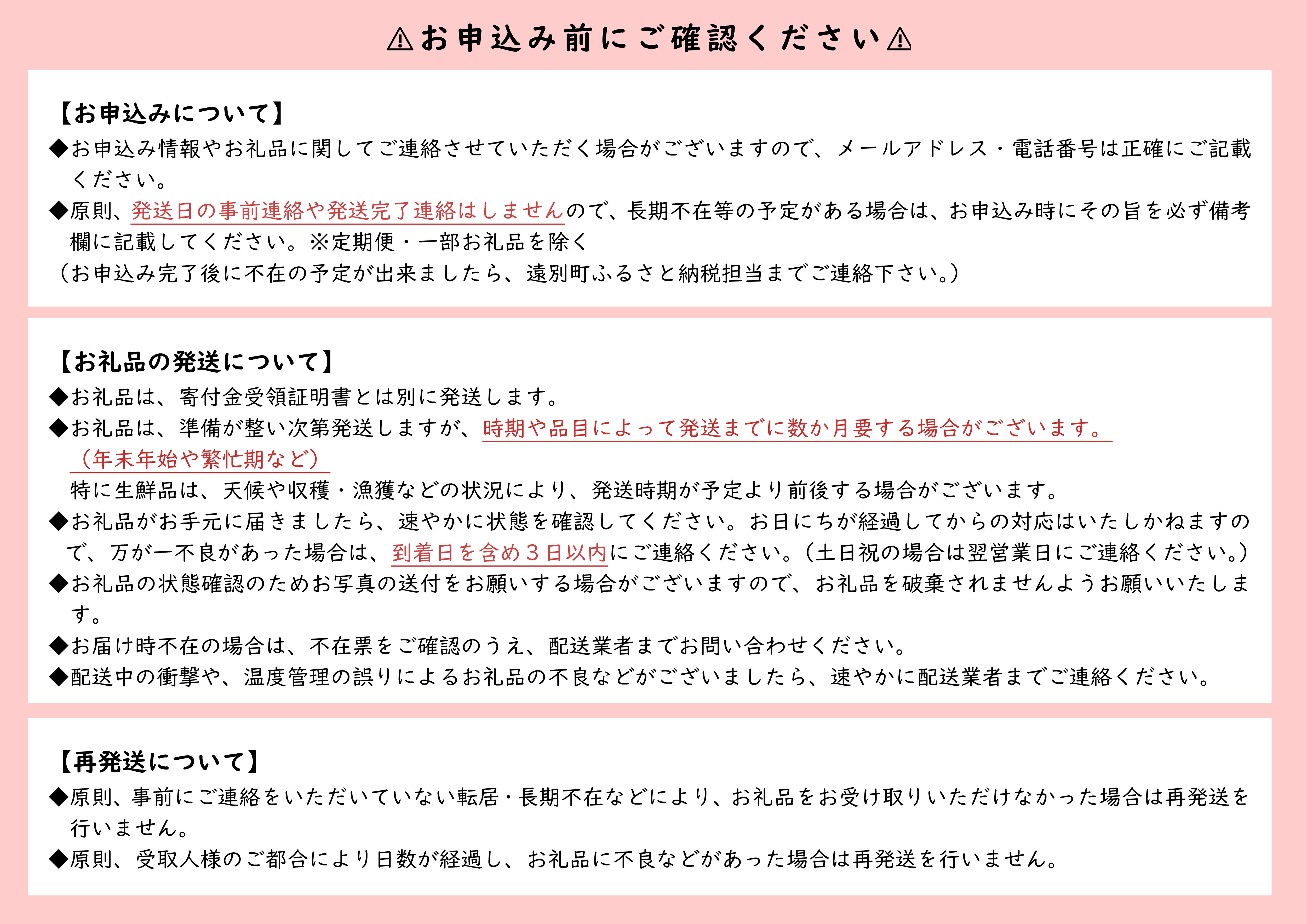 (お申込み完了後に不在の予定が出来ましたら、北海道遠別町ふるさと納税サポートセンターまでご連絡ください。)