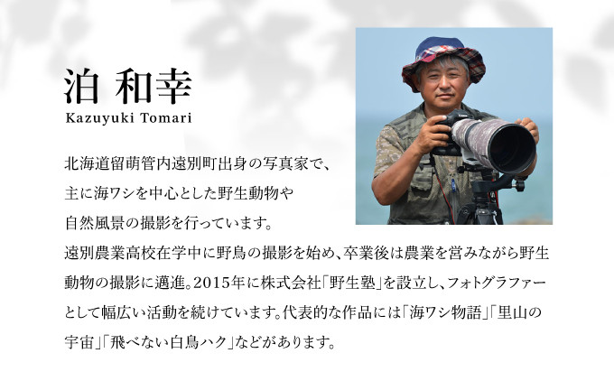 遠別町在住の自然写真家 泊和幸さんのポストカードです。 北海道の大自然の中、力強く生きる野生動物のありのままの姿をご覧ください。 泊和幸: 北海道遠別町生まれ。遠別農業高校在学中に野鳥の撮影を始め卒業後、農業の傍ら野生動物の撮影に邁進。 株式会社 野生塾を設立しフォトグラファーとして活動を続ける。 北海道内(札幌市、旭川市、帯広市ほか)、東京(銀座)写真展を行っている。 北海道北部の日本海沿岸で生きる野生動物を撮影している。