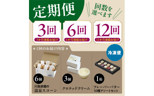 容量 | 【定期便】3・6・12か月 ■川島旅館の温泉スコーン(60g~80g)6個 ▼下記のフレーバーからからランダムで計6個入ります プレーン、アールグレイ、パルメザン、抹茶、ラムレーズン、ダブルチョコ、 シナモン、チョコチップ、黒豆クリームチーズ、レモンピールピスタチオ、抹茶ホワイトチョコ ※プレーンスコーンは必ず1個以上入ります。 ■クロテッドクリーム 60g×3個 ■とよとみフレーバーバター(各10g) はちみつバター、いちごバター、ハスカップバター、ブルーベリーバター さくらんぼバター、みそバター、山わさびバター、鮭ぶしバター、利尻昆布バター、バジルバター |