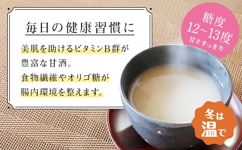 ・全国名水百選にも選ばれた甘く清らかな雪解け伏流水を使用した日本酒。その日本酒の絞りかすから生まれた甘酒は豊富な滋養分を含みます。