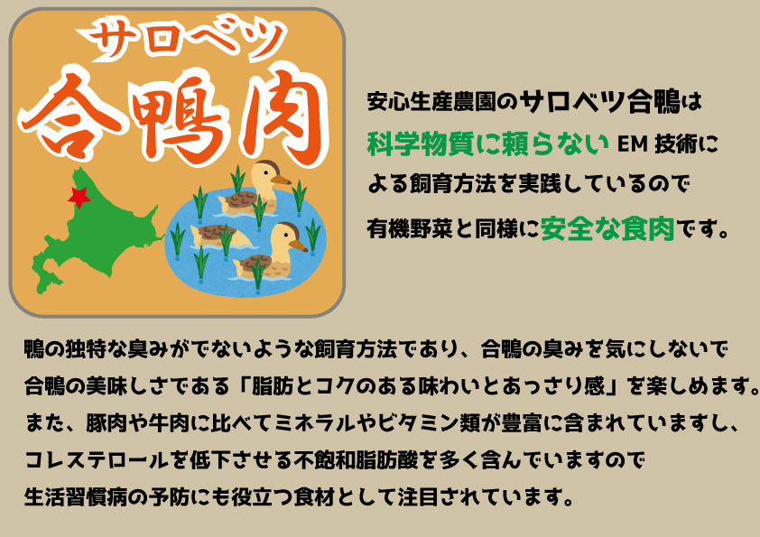 化学物質に頼らないこだわりの配合飼料で飼育された安心・安全な「サロベツ合鴨」製品です。