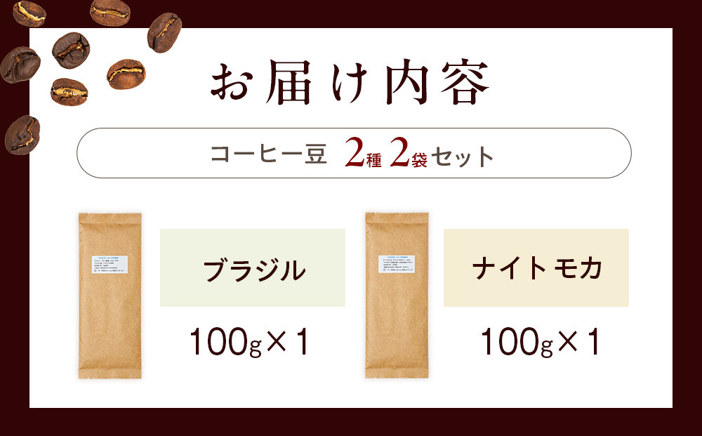 | 容量 | 1.【ブラジル】100g×1袋 2.【ナイト モカ】100g×1袋 コーヒー豆:100g×2袋(合計200g) |